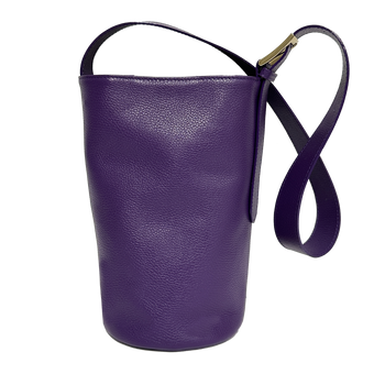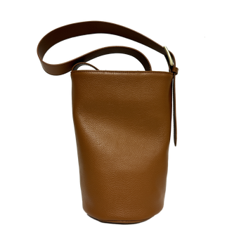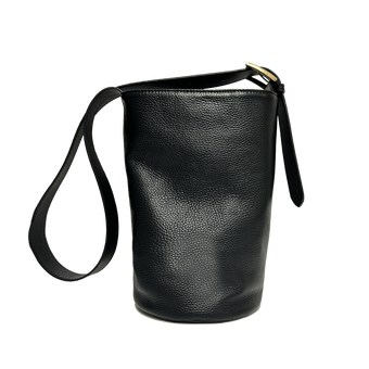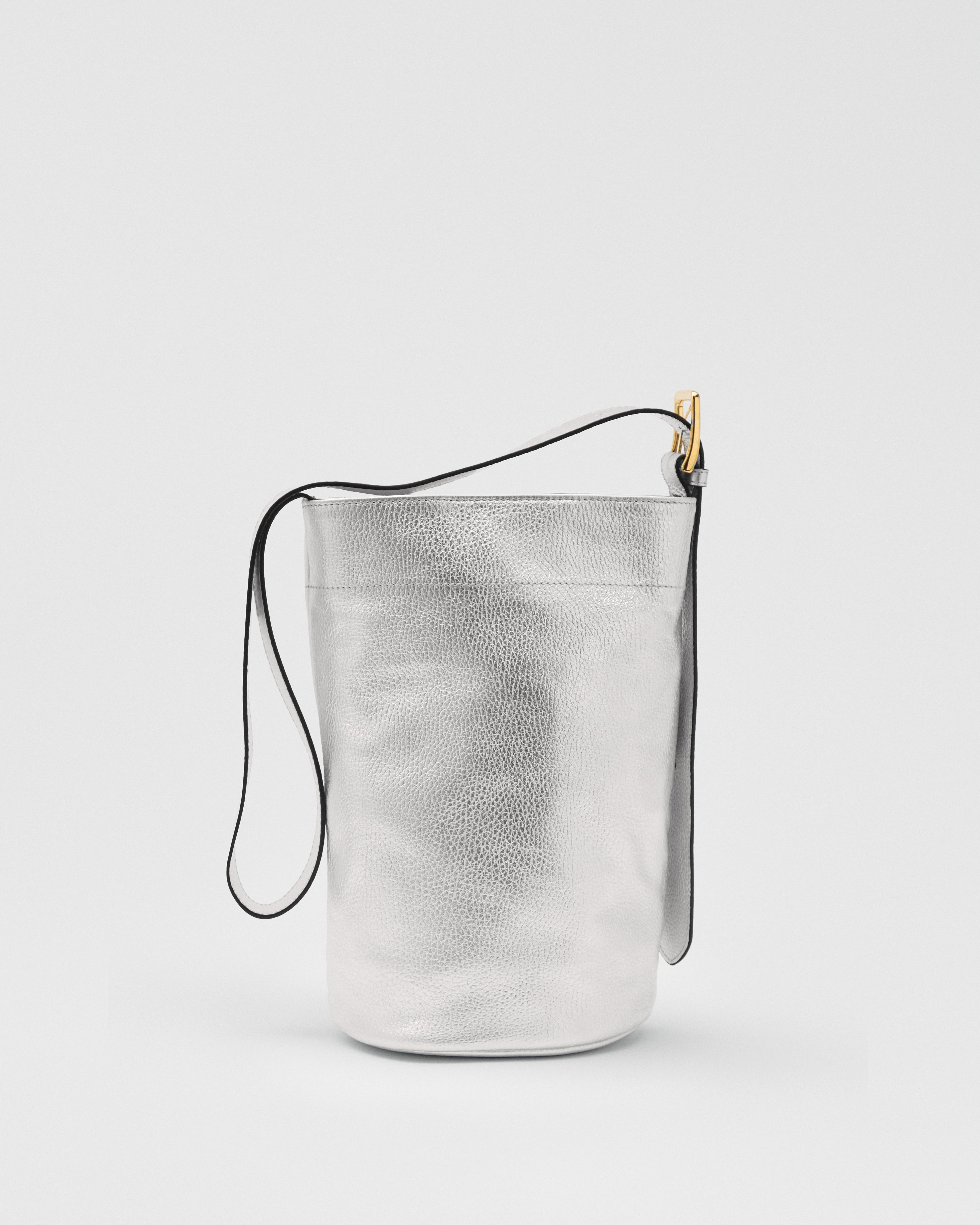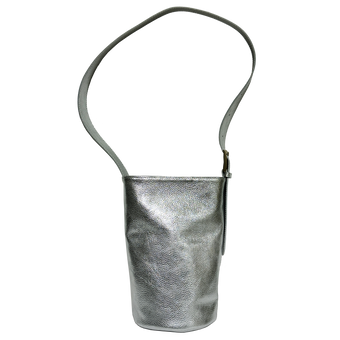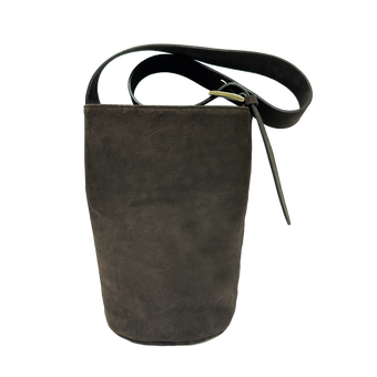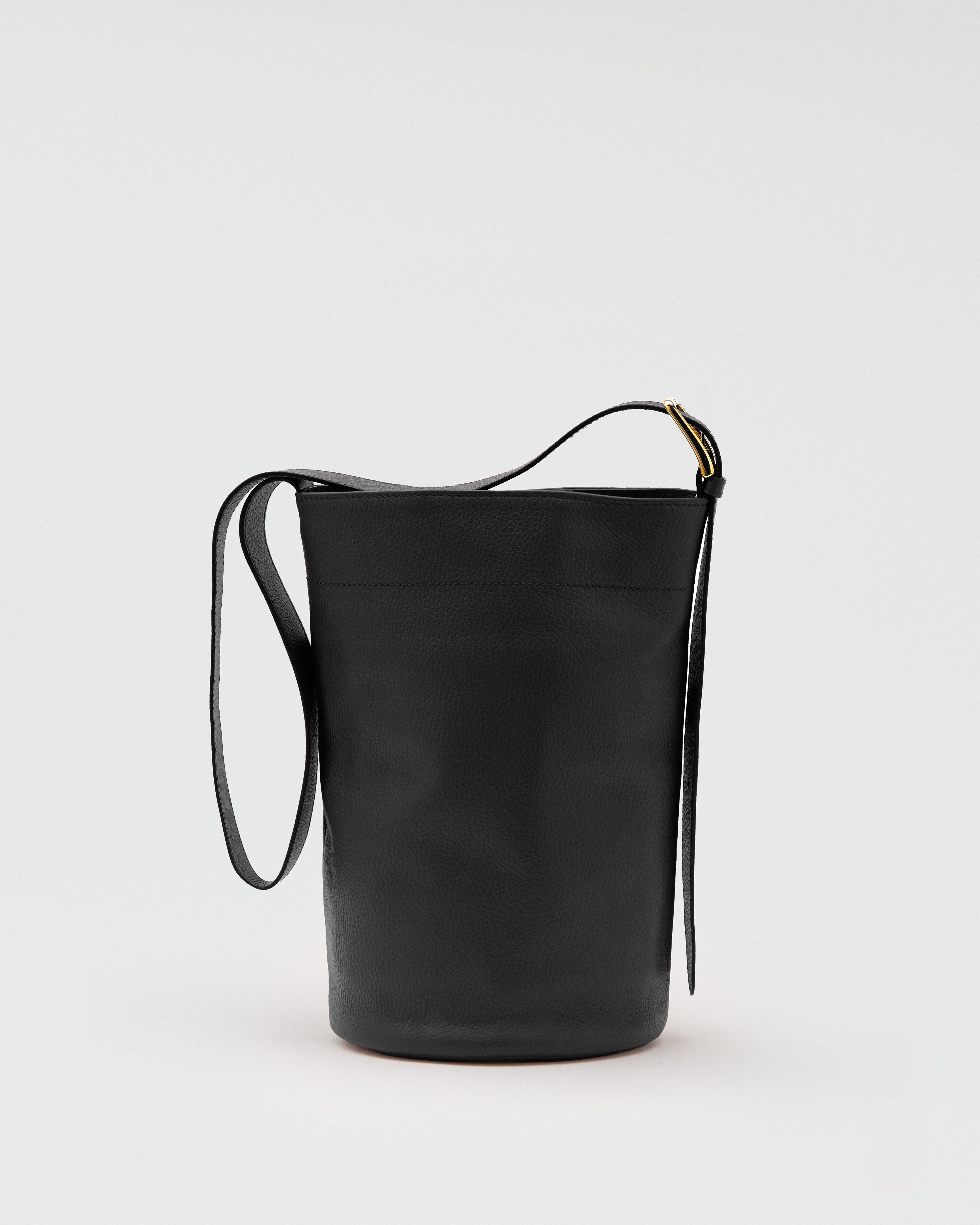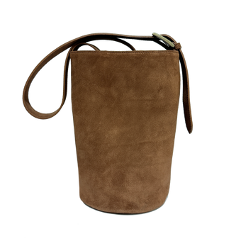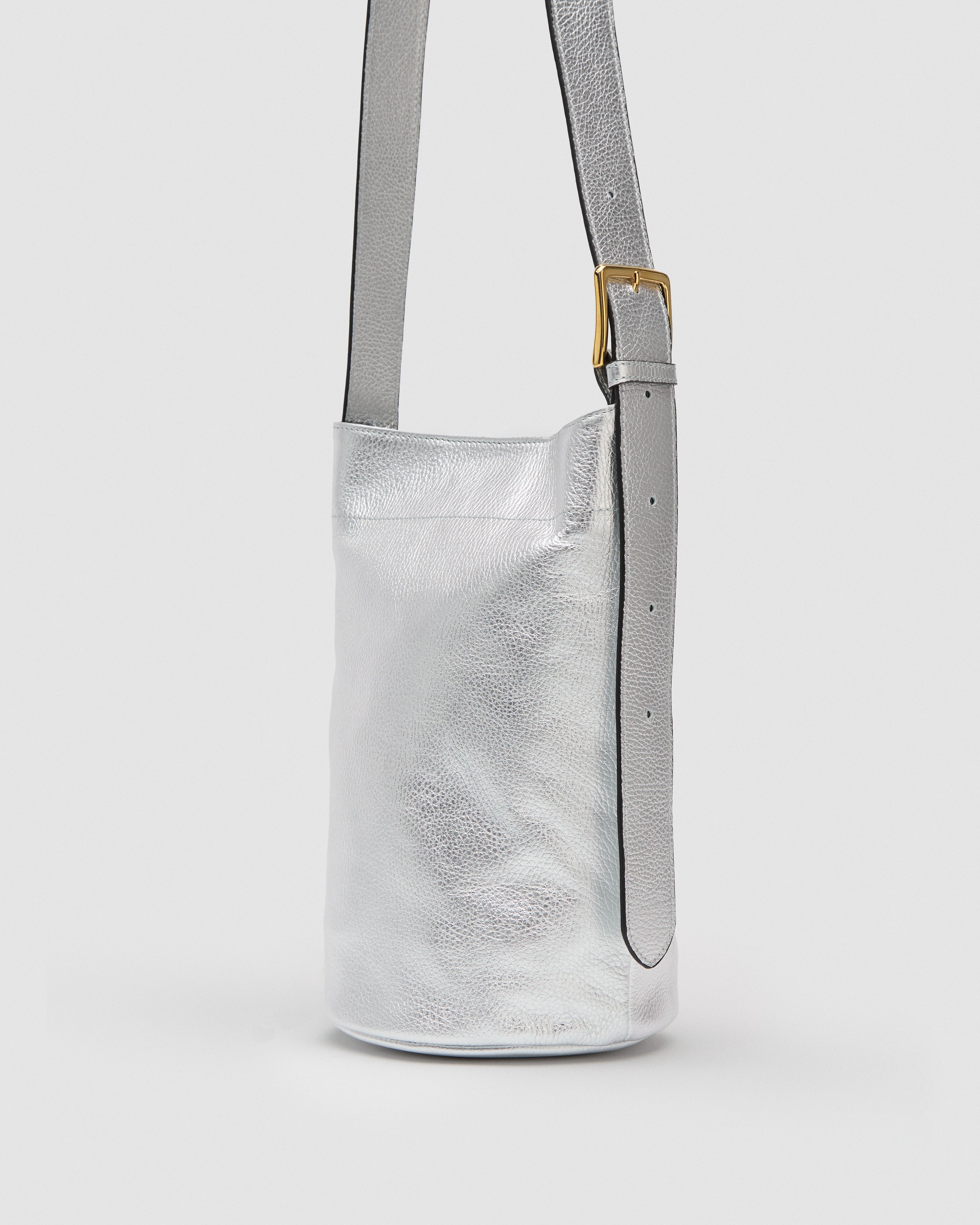 More slender than a traditional bucket bag, it features a soft, fluid silhouette.