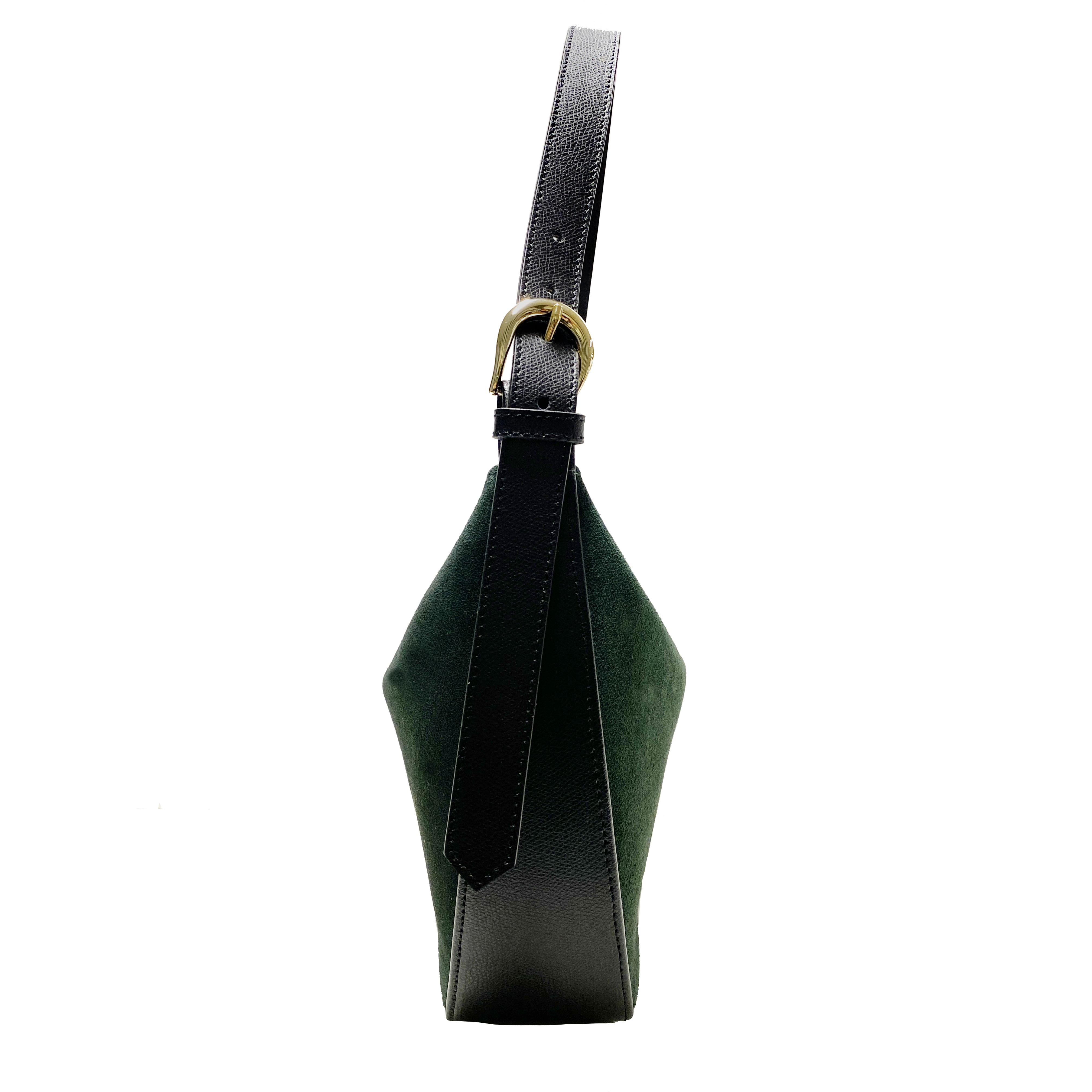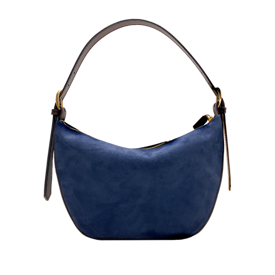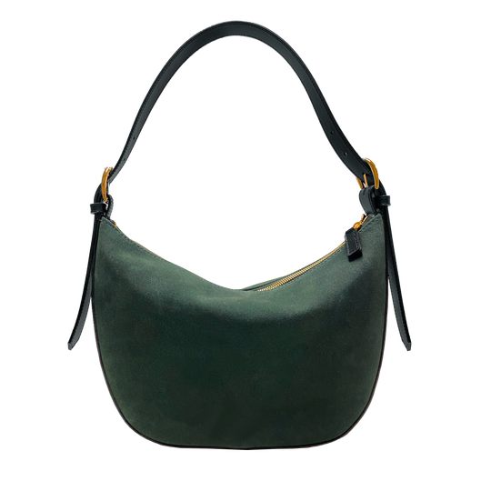 A medium-sized hobo bag with undeniable coolness. Crafted in suede or shearling with saffiano leather details, it blends elegance with personality.