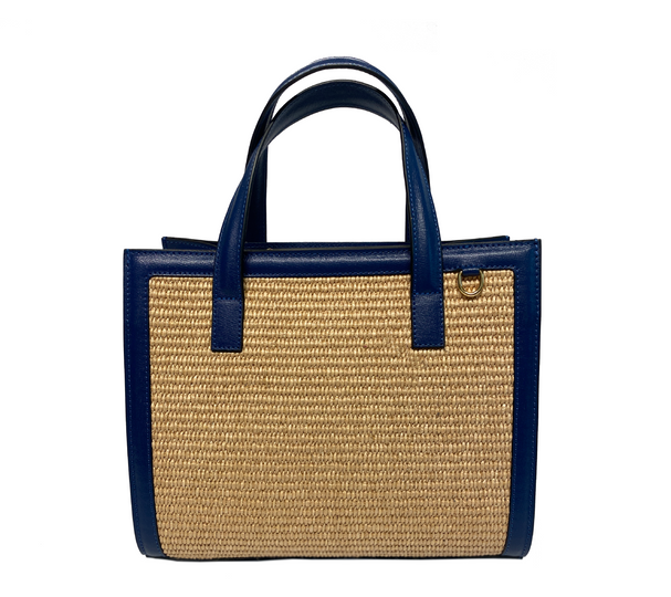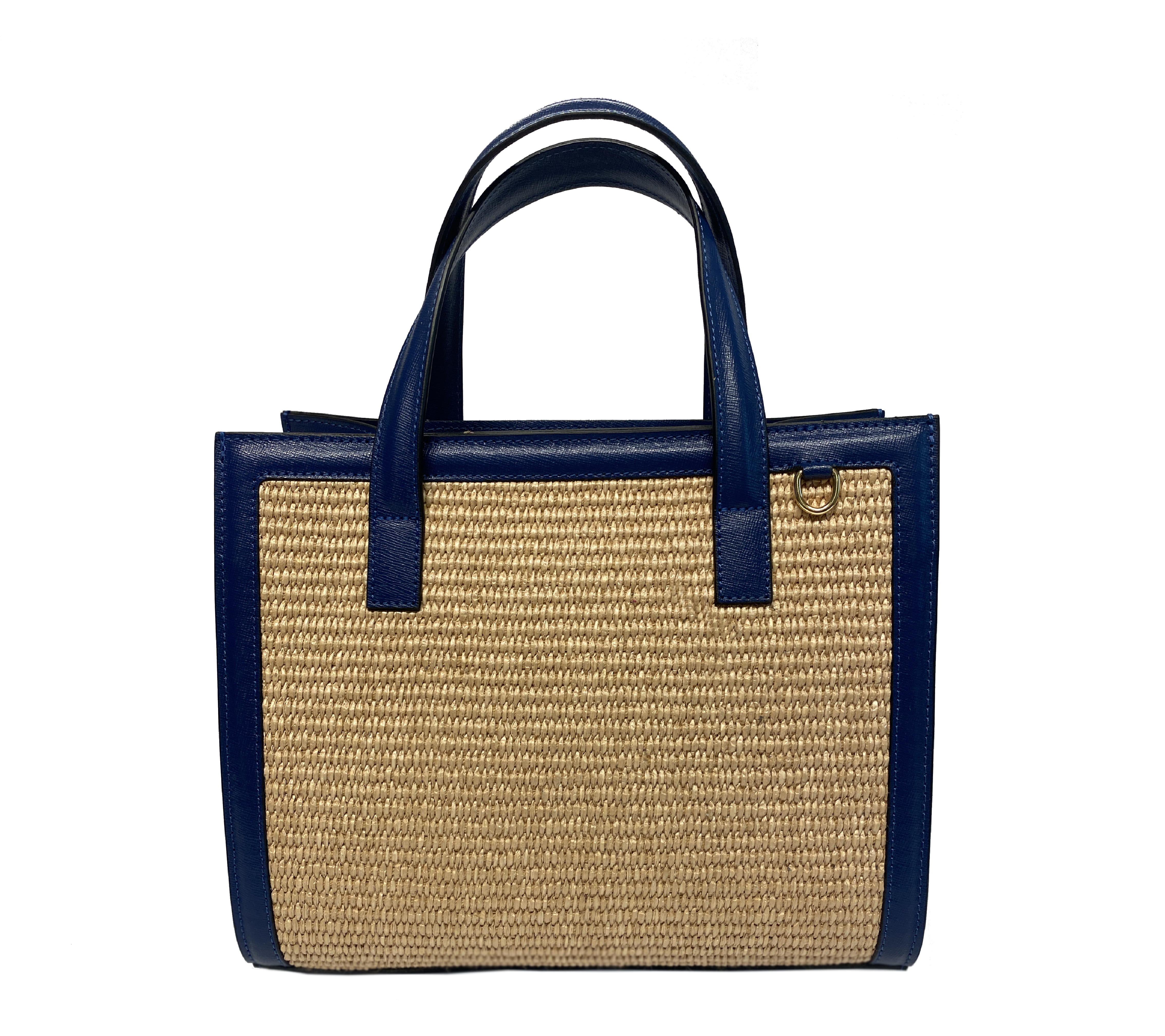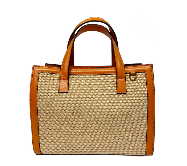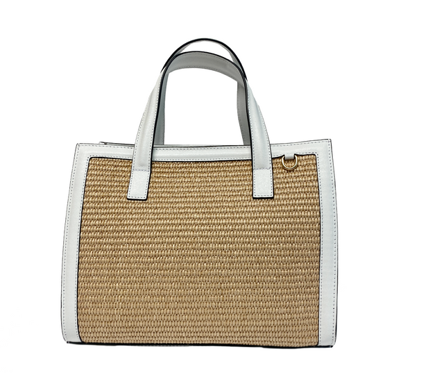 Made from raffia, suede, or shearling with saffiano leather details. Can be carried by hand or worn crossbody.