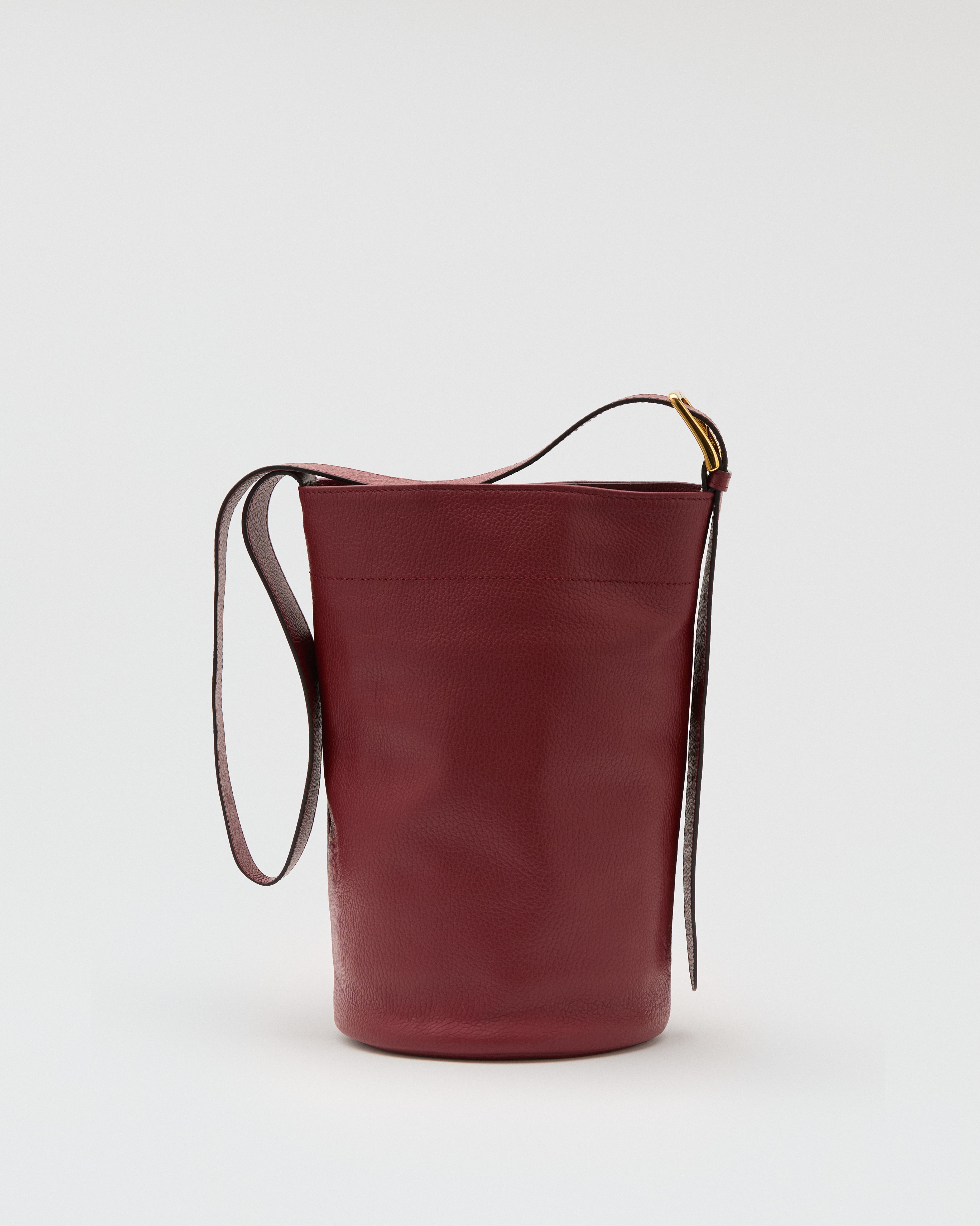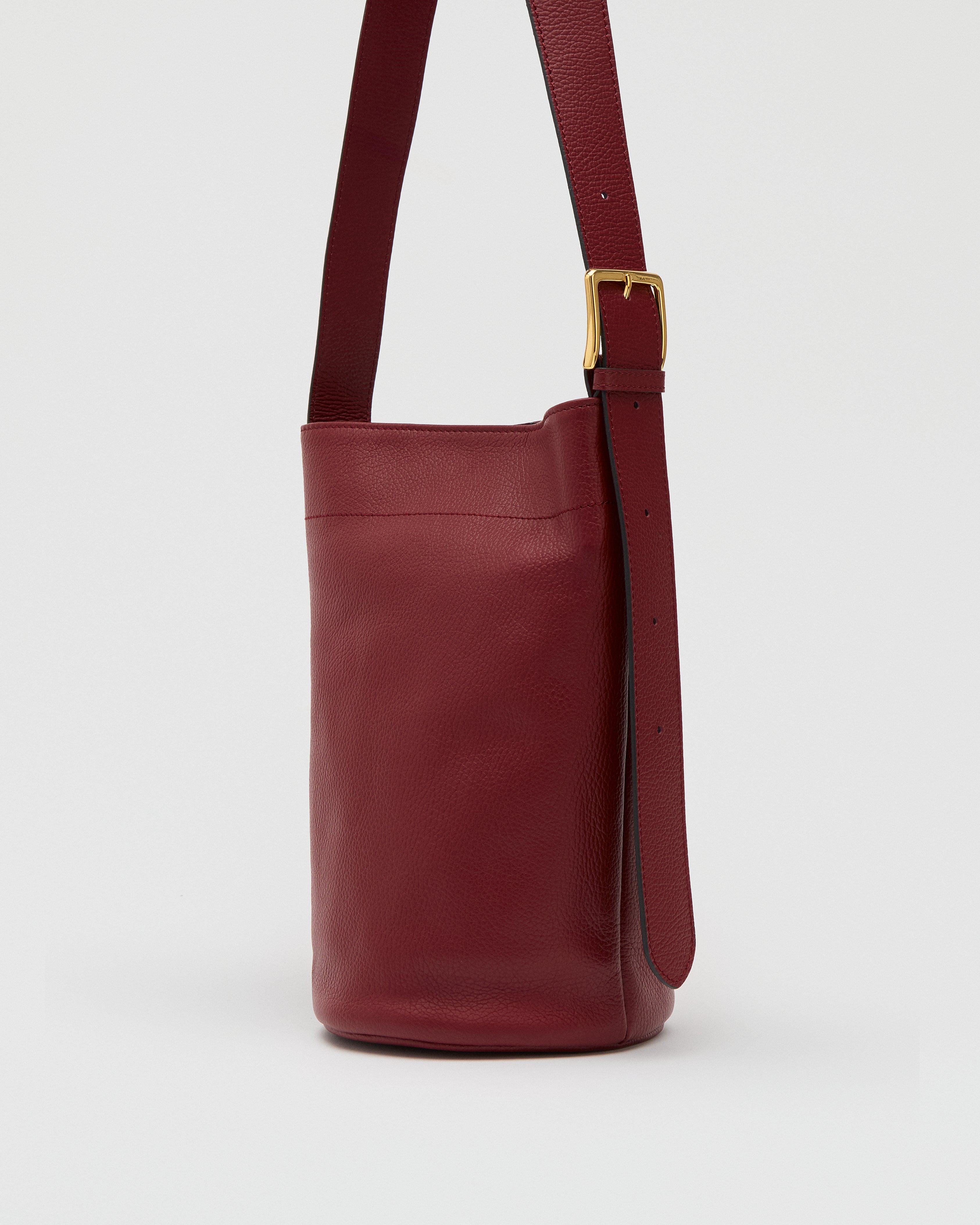 Più slanciato di un secchiello tradizionale, ha una silhouette morbida. Indossato a spalla o a tracolla è perfetto per un look disinvolto. La chiusura con bottone a pressione lo rende pratico e funzionale, mentre la tracolla con fibbia elegante aggiunge un tocco sofisticato.