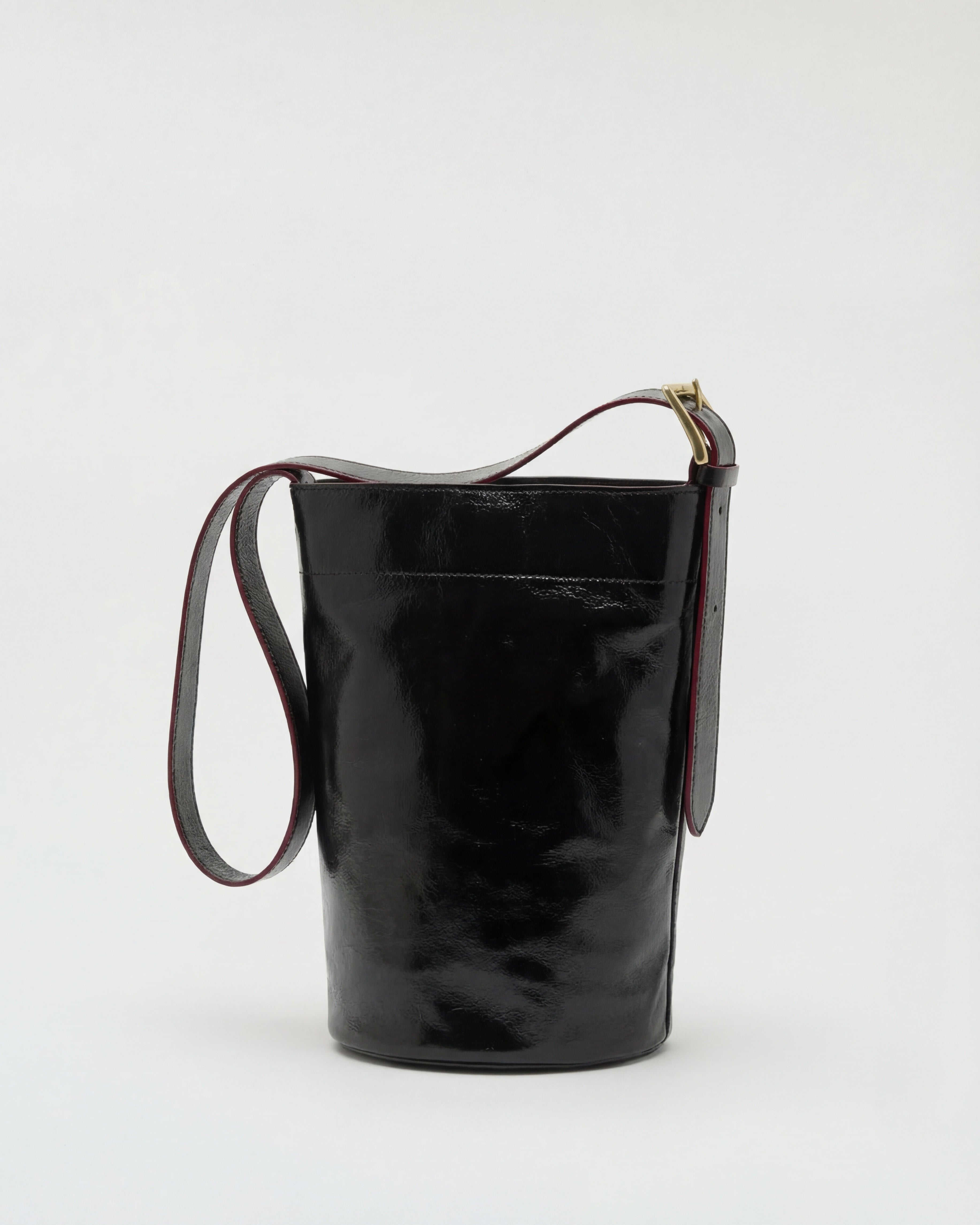 Più slanciato di un secchiello tradizionale, ha una silhouette morbida. Indossato a spalla o a tracolla è perfetto per un look disinvolto. La chiusura con bottone a pressione lo rende pratico e funzionale, mentre la tracolla con fibbia elegante aggiunge un tocco sofisticato.