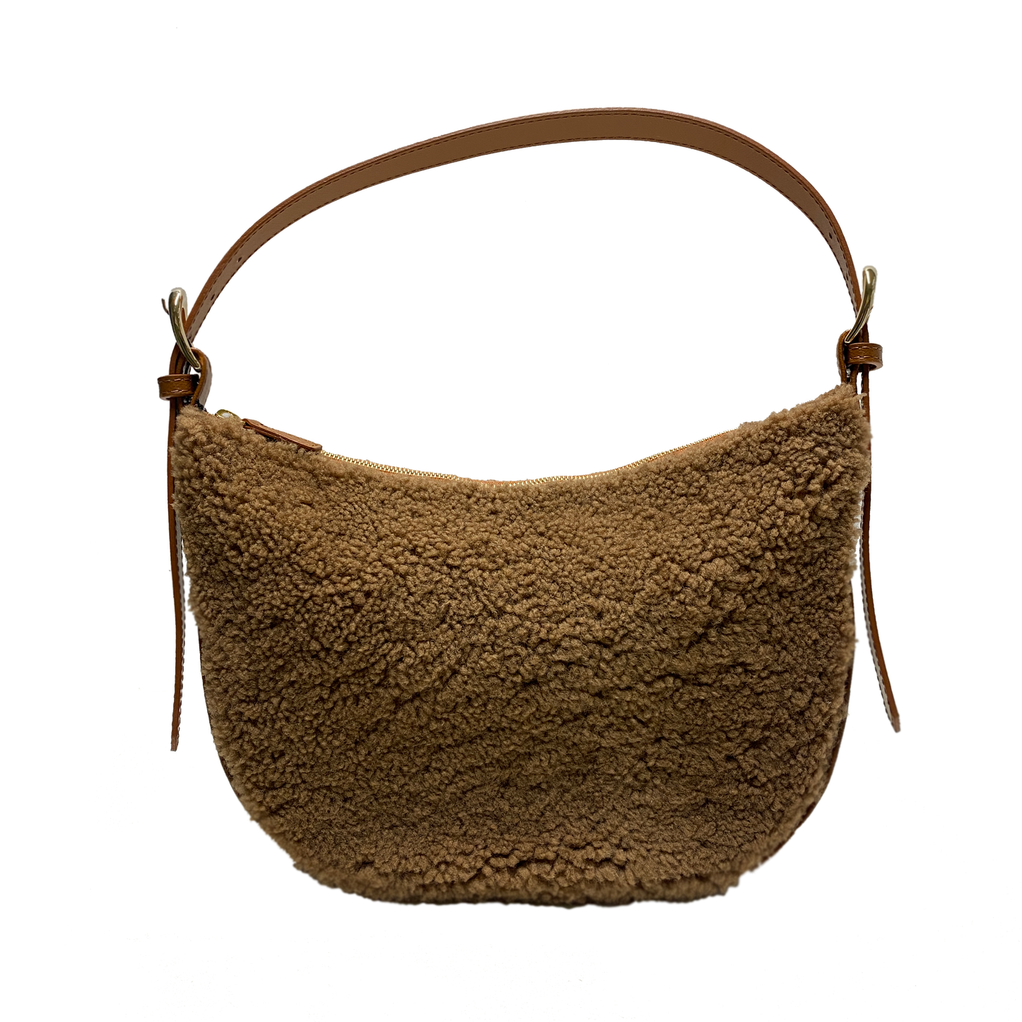 Una hobo di media misura, decisamente cool. In montone con dettagli in pelle saffiano, unisce eleganza e carattere.
