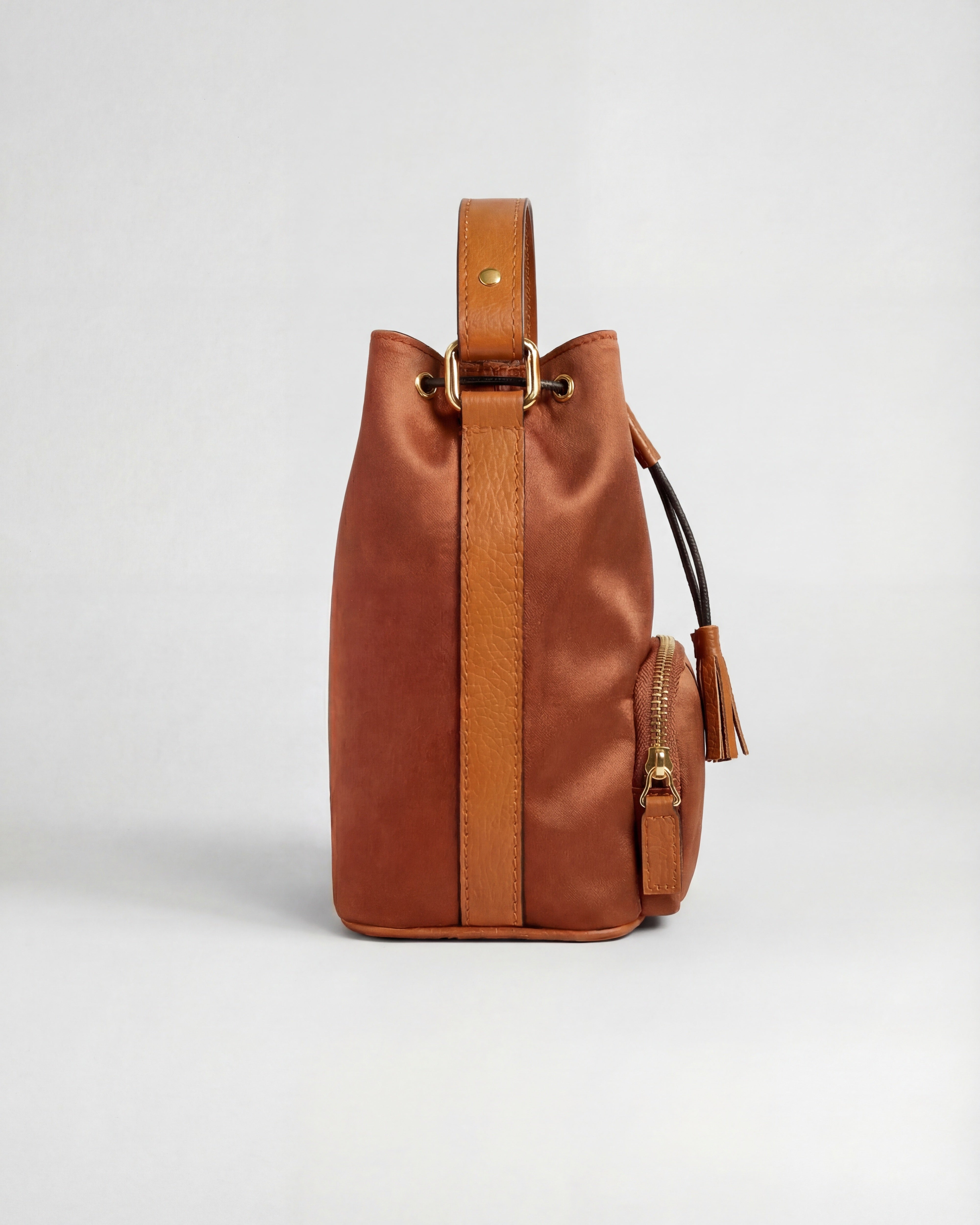 Elegantemente senza sforzo, Agathe è una borsa a secchiello che unisce la morbida lucentezza del raso alla resistenza senza tempo della pelle martellata. Il corpo in raso liscio dona una finitura raffinata e luminosa, mentre i dettagli e il manico in pelle aggiungono struttura, calore e qualità duratura.