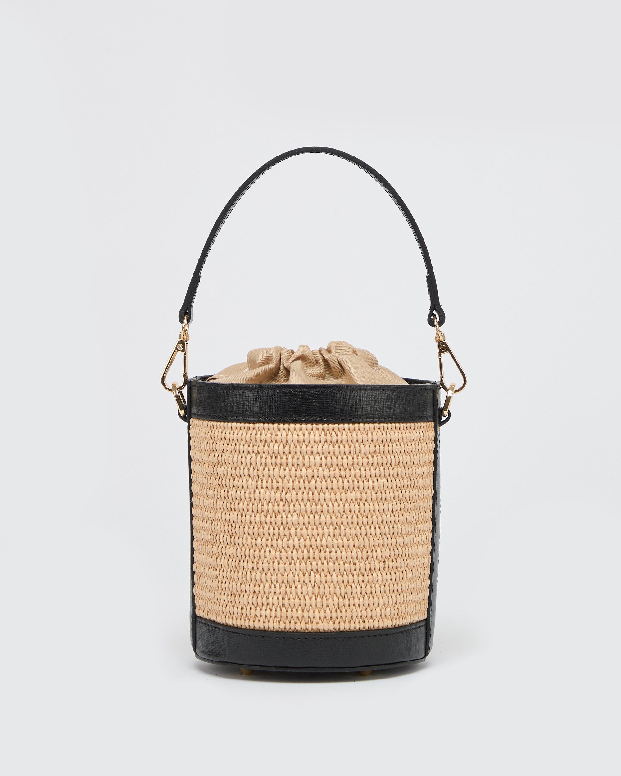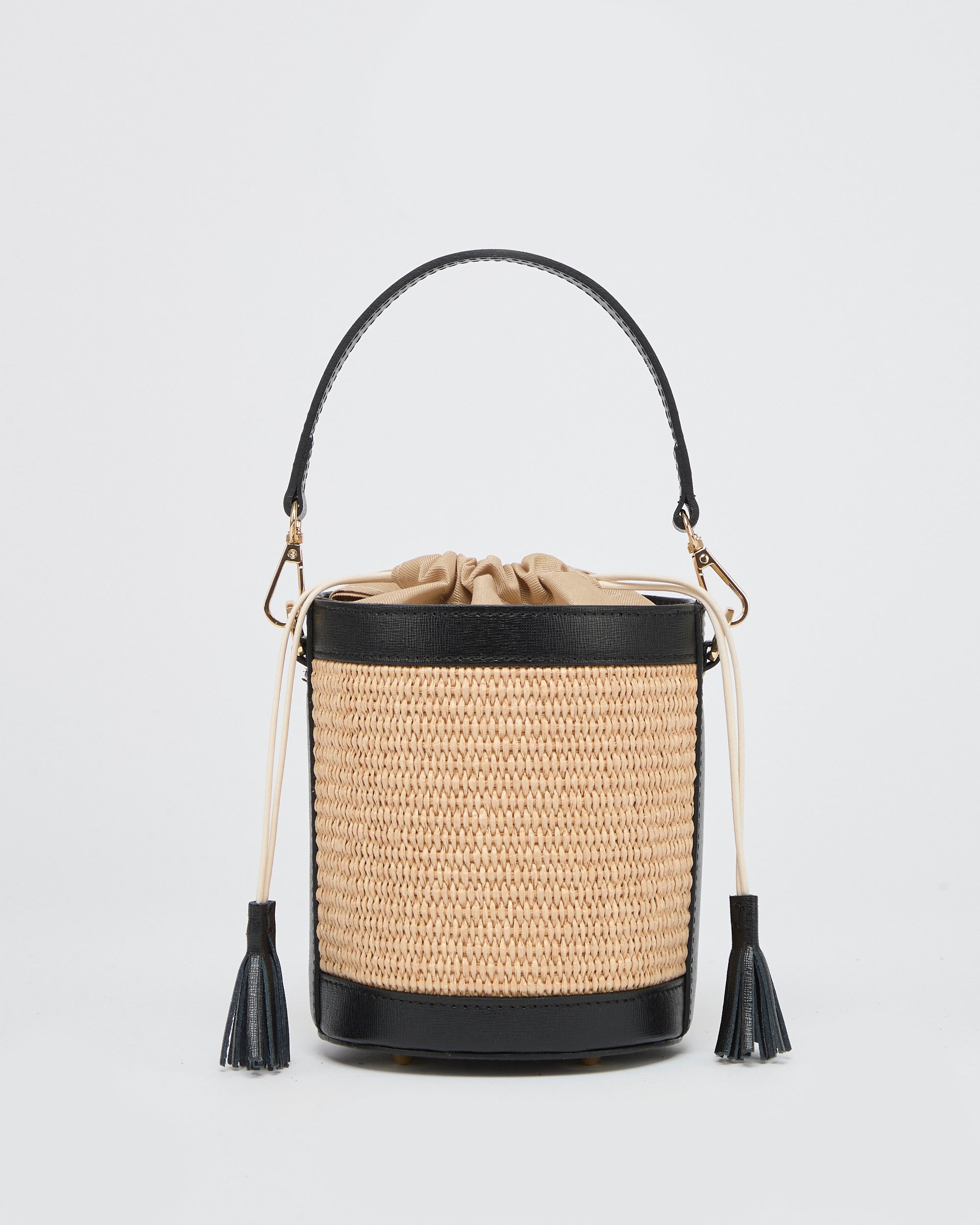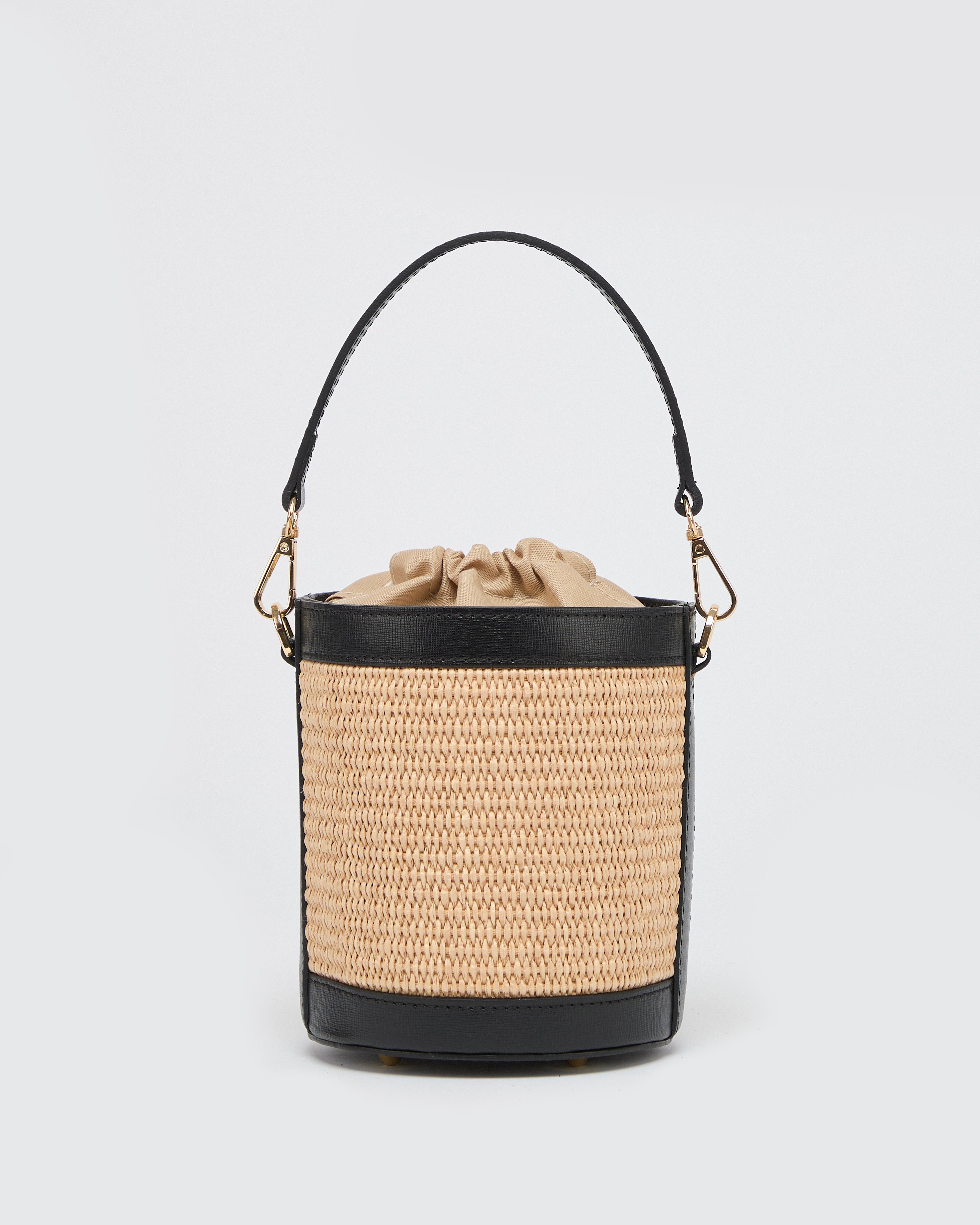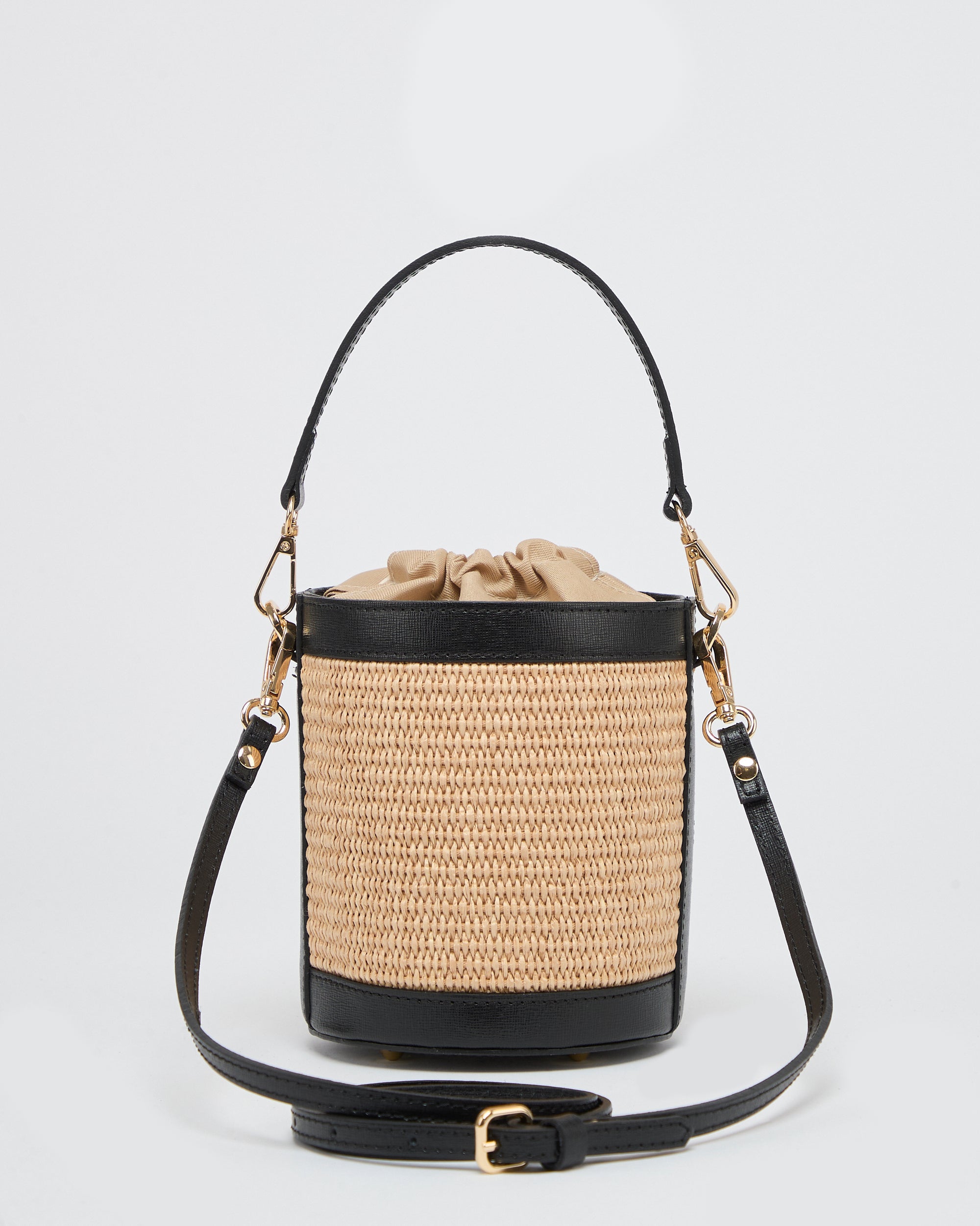 Crafted in raffia with saffiano leather details, it stands out for its absolute elegance and refinement.