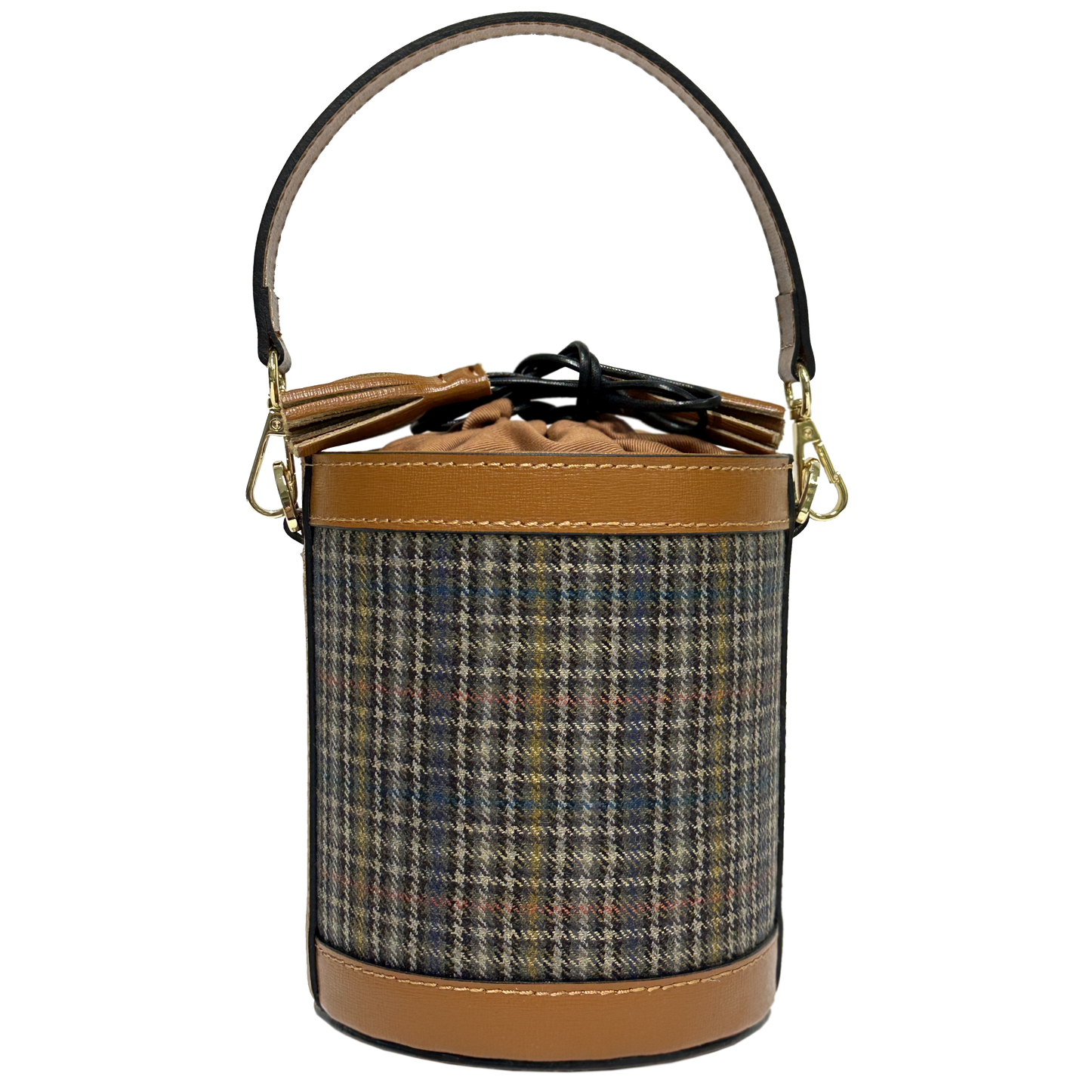Crafted from tartan-effect fabric with saffiano leather details, it stands out for its pure, unmistakable elegance.