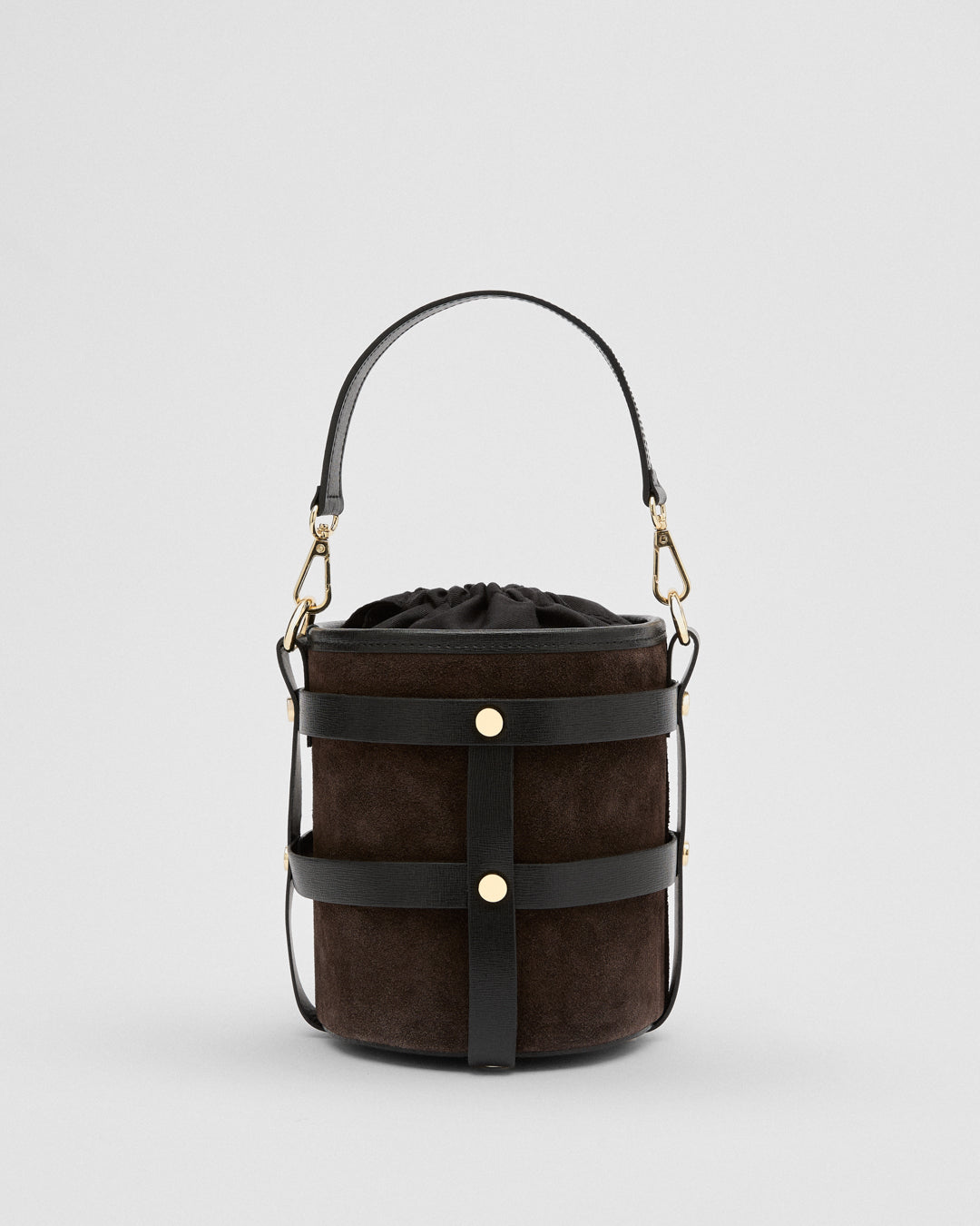 Its suede core, framed by saffiano leather bands, creates a refined contrast, while gold stud-effect details add a strong, distinctive flair.