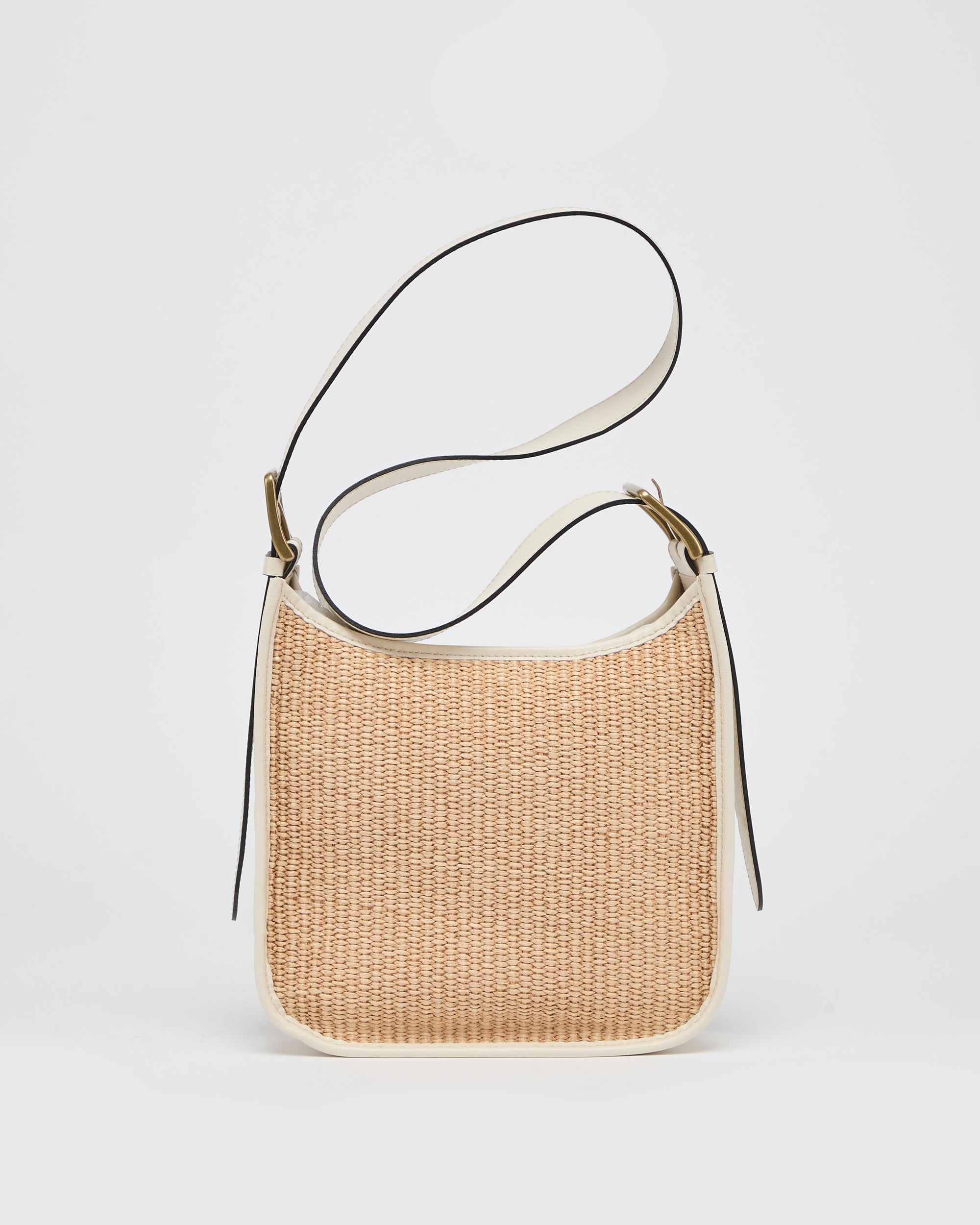 Crafted from raffia, it is enhanced by saffiano leather trims and gold-tone metal accents that highlight its design.
