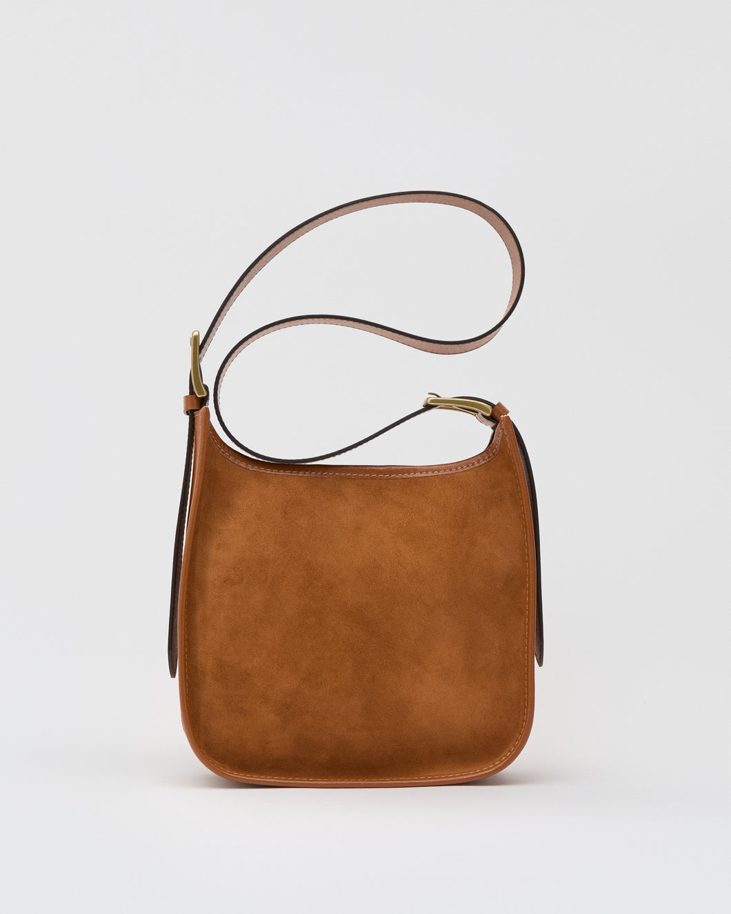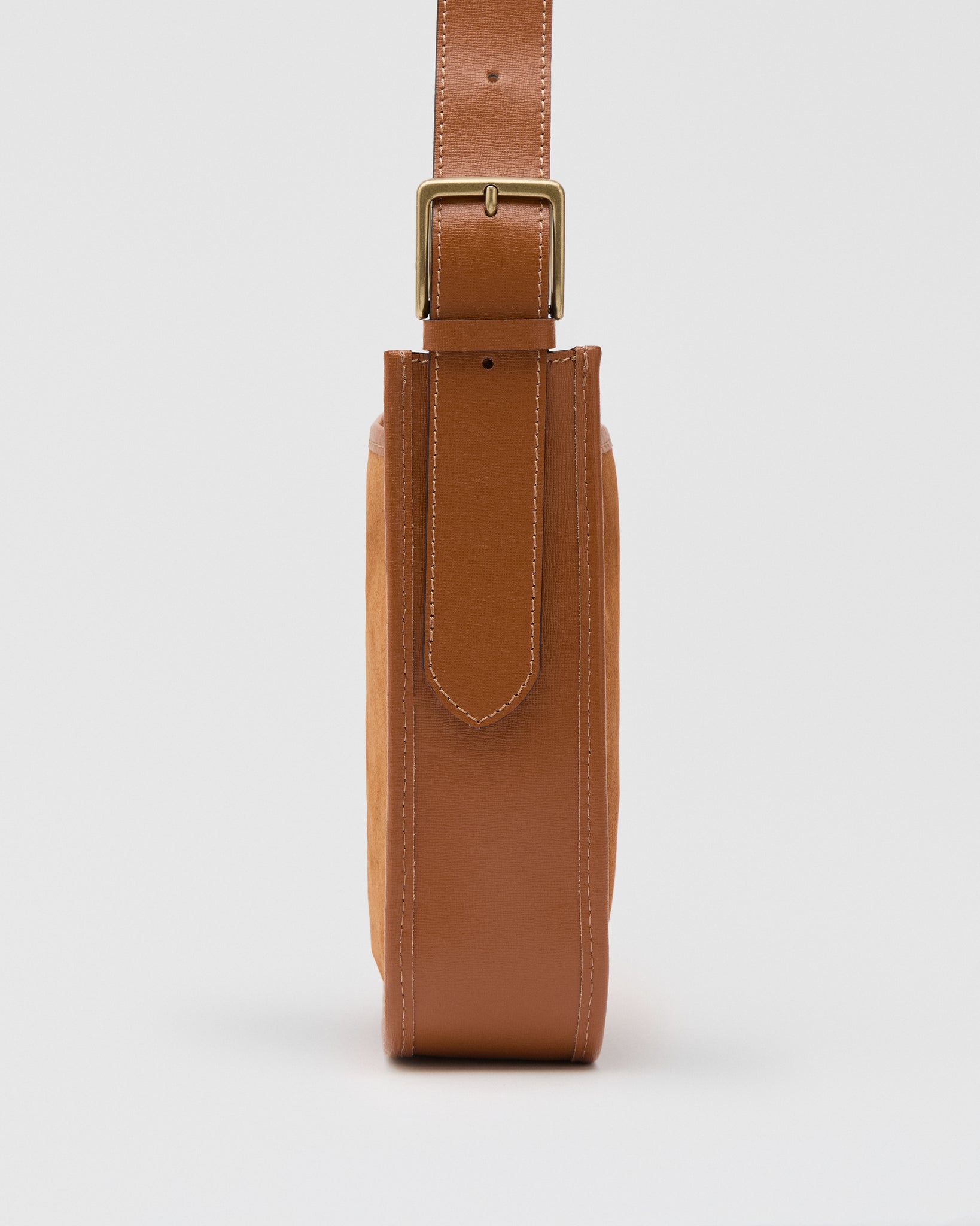 Crafted from suede and enhanced with saffiano leather trim and gold-tone metal accents, it stands out for its elegant design.